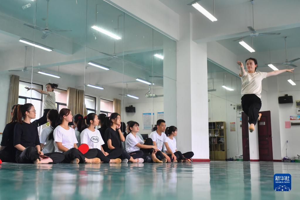 在長(cháng)沙職業(yè)技術(shù)學(xué)院特殊教育學(xué)院的舞蹈房里,鄧蕓虹(右)為學(xué)生示范舞蹈動(dòng)作(9月7日攝)。
