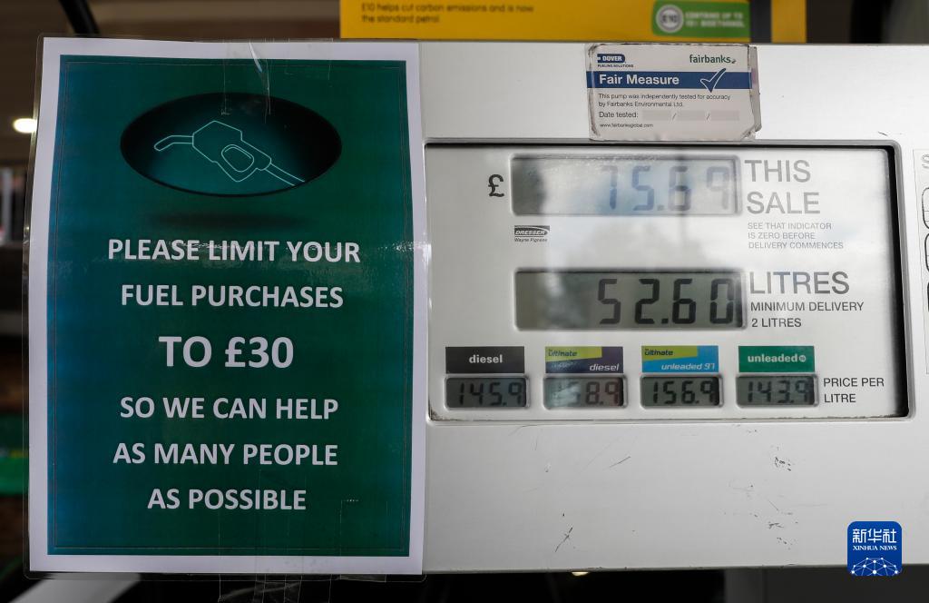9月27日,英國倫敦一家加油站的加油機上貼著(zhù)每人限購最多30英鎊燃油的告示。新華社記者 韓巖 攝