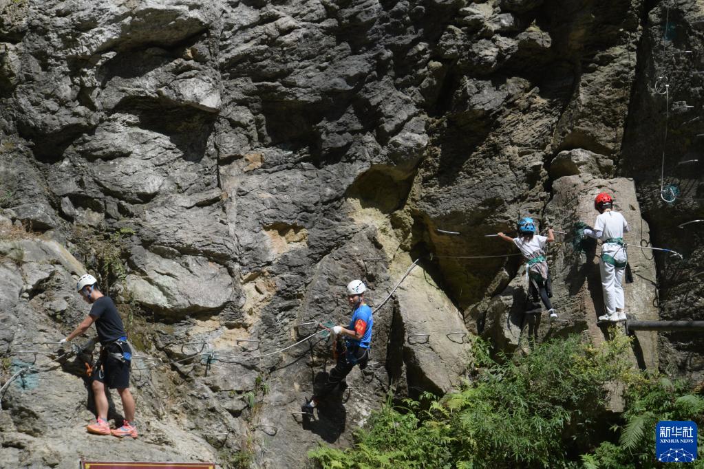 10月2日,在貴陽(yáng)市開(kāi)陽(yáng)縣南江大峽谷,游客在安全員的陪護下體驗攀巖。