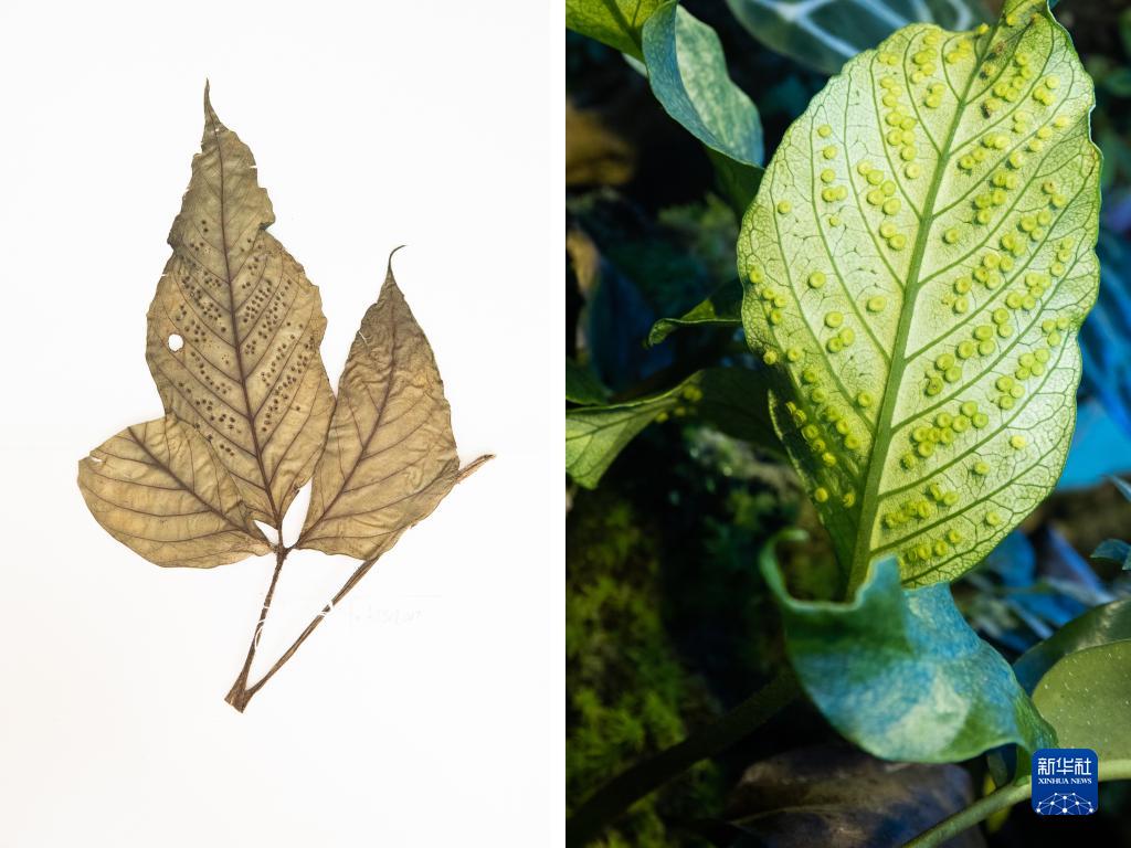 這是10月10日在昆明植物園拍攝的天星蕨。這張拼版照片分別為科研人員野外采集的標本(左)和在植物園遷地保護后存活下來(lái)的同種植物。