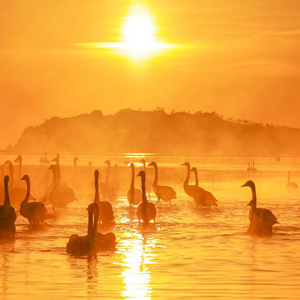冬日清晨,山東榮成大天鵝國家級自然保護區晨霧裊裊,大天鵝在晨曦中游弋覓食、起舞飛翔,吸引眾多游客前來(lái)觀(guān)賞拍照。