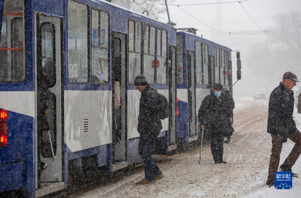 12月1日,人們在拉脫維亞里加的雪中出行。