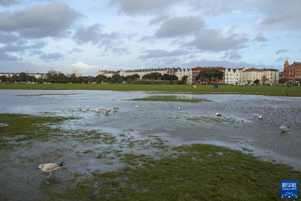 這是12月8日在英國樸次茅斯拍攝的一個(gè)海濱公園里的積水。