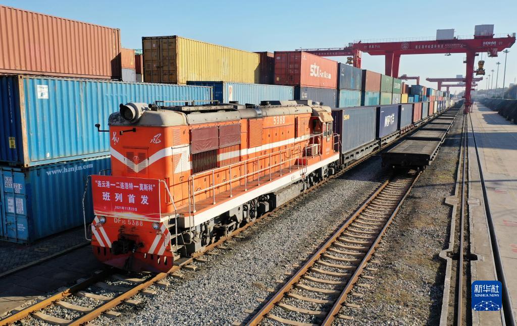 “連云港—二連浩特—莫斯科”中歐班列在江蘇連云港中哈物流基地整裝待發(fā)(11月23日攝,無(wú)人機照片)。新華社發(fā)(王健民 攝)