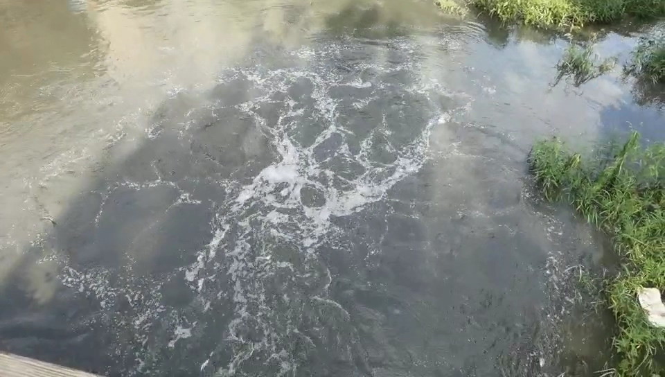 督察組現場(chǎng)督察發(fā)現,平房污水處理廠(chǎng)排口漂浮大量泡沫。督察組供圖