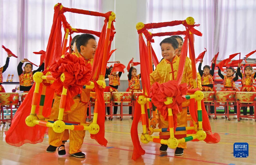1月13日,山東省煙臺市福山區實(shí)驗幼兒園的小朋友表演劃旱船。