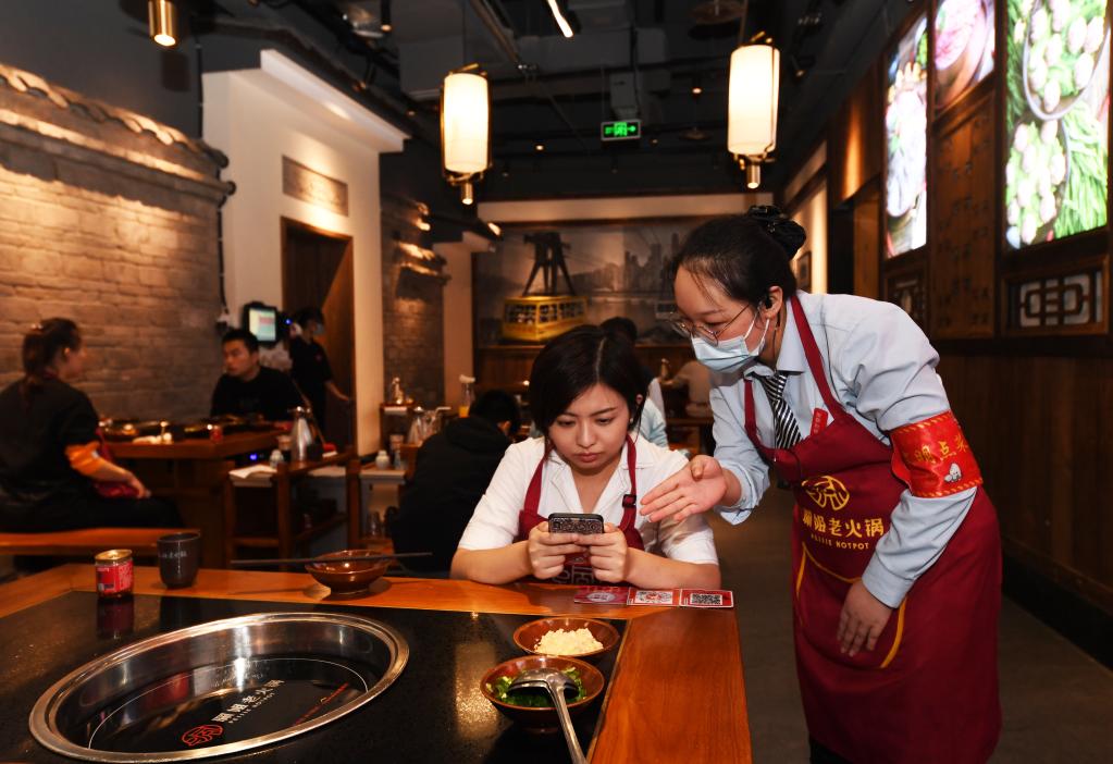 重慶來(lái)福士一家老火鍋餐廳的“文明點(diǎn)菜員”(右一)向消費者推薦“小份菜”。(新華社記者王全超 攝)