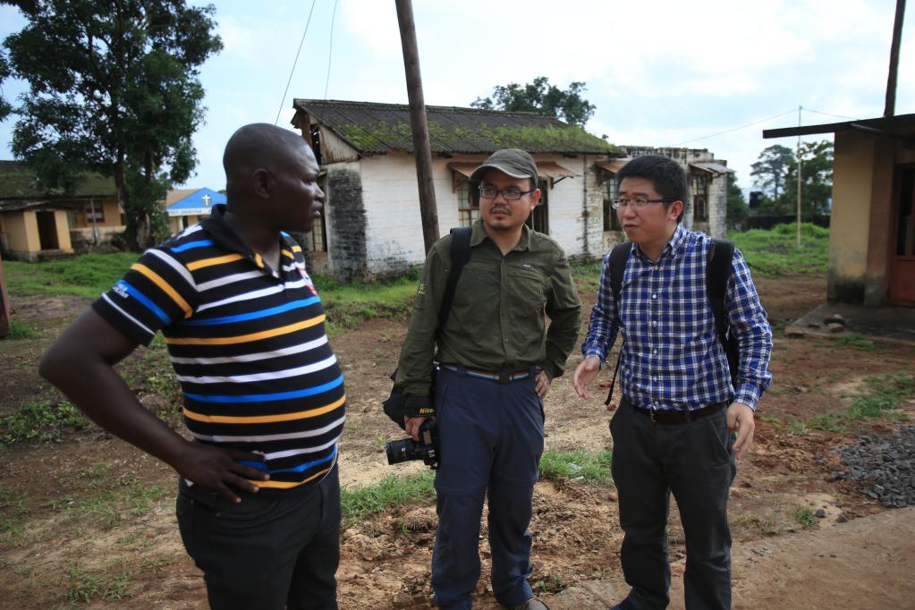 林曉蔚(中)與新華社記者李斯博(右)在塞拉利昂首都弗里敦采訪(fǎng),2014年8月16日攝。(新華社記者孟晨光攝)
