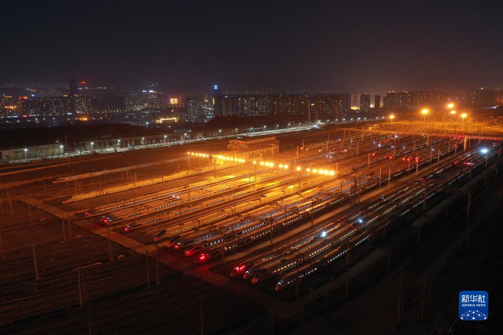1月16日晚,動(dòng)車(chē)組列車(chē)??吭谥袊F路蘭州局集團有限公司蘭州車(chē)輛段蘭州西動(dòng)車(chē)運用所整備場(chǎng)上,為1月17日開(kāi)始的2022年春運做好準備(無(wú)人機照片)。新華社記者 杜哲宇 攝