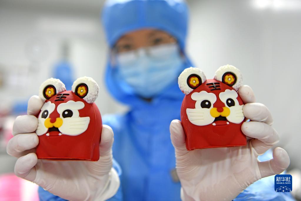 1月12日,在安徽省淮南市八公山區工業(yè)集聚區內,一家食品企業(yè)的員工展示用巧克力制作的生肖虎蛋糕裝飾。