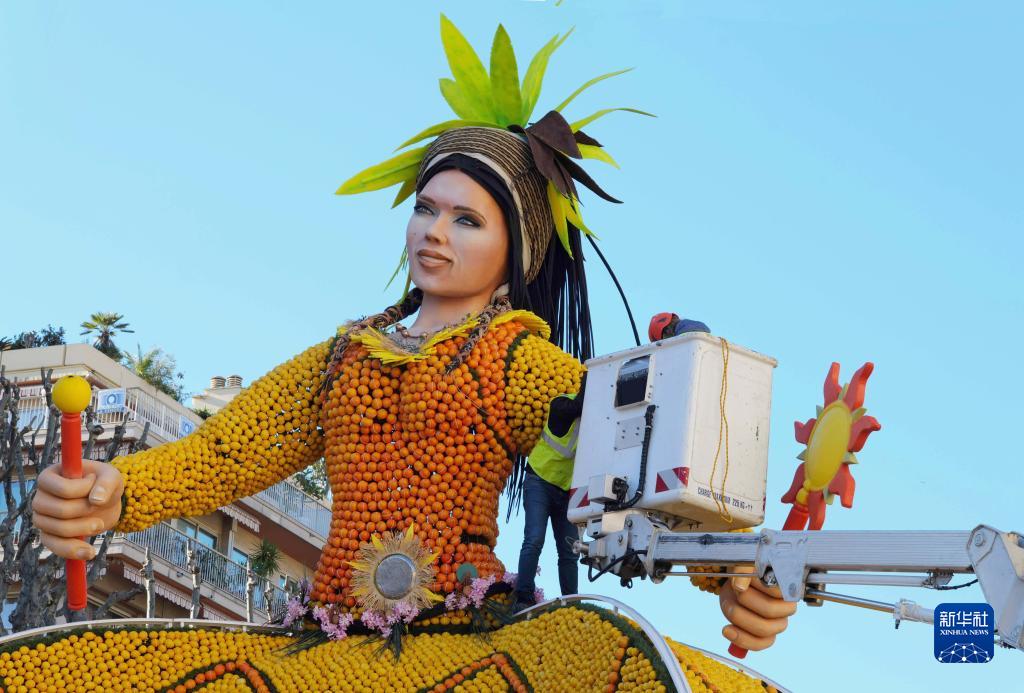 2月9日,工作人員在法國南部小城芒通裝飾檸檬節藝術(shù)裝置。