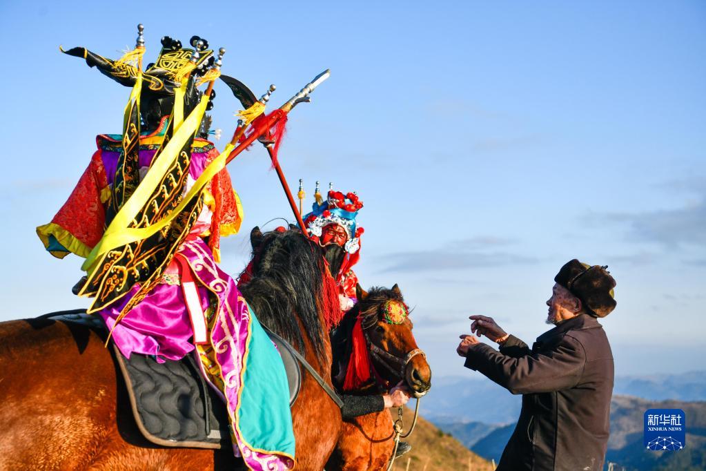 2月7日,龍里太平花燈戲藝人朱永興(右一)在指導村里的年輕人排練花燈戲。