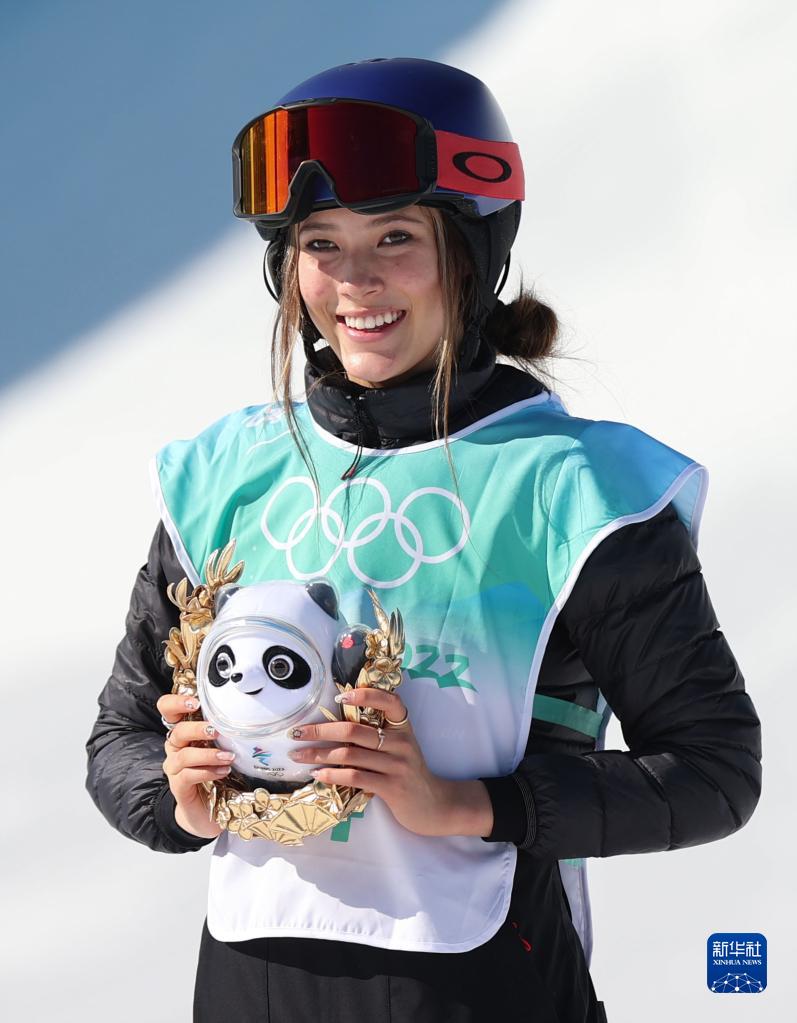2月8日,自由式滑雪女子大跳臺比賽冠軍、中國選手谷愛(ài)凌在頒發(fā)紀念品儀式上。新華社記者 丁旭 攝