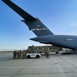 美國中央司令部司令肯尼思·麥肯齊2021年8月30日宣布,美軍已完成從阿富汗撤出的任務(wù)。這是當年8月28日一架CH-47運輸直升機在阿富汗喀布爾國際機場(chǎng)被裝載到C-17運輸機上。(新華社發(fā))