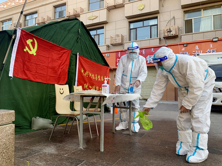 中共阿拉善盟委統戰部?jì)擅h員在額濟納旗一小區執勤點(diǎn)消毒(2021年10月28日攝)。新華社記者 王靖 攝