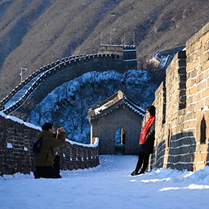 游客在白雪覆蓋的慕田峪長(cháng)城拍照留影(2月14日攝)。