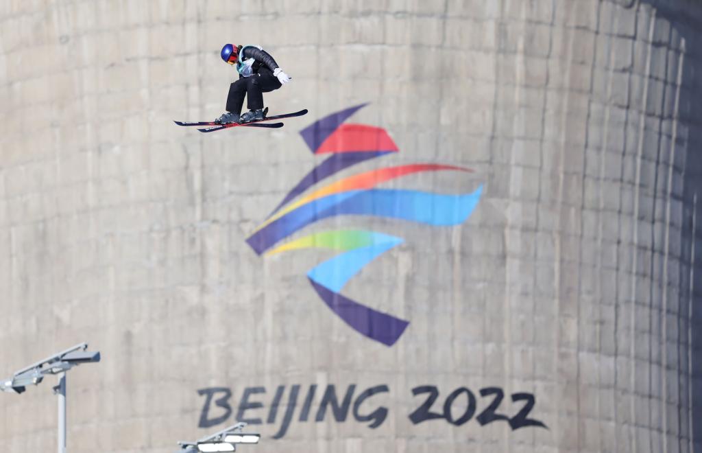 2月8日,中國選手谷愛(ài)凌在比賽中。她的空中姿勢和“冬”字形會(huì )徽十分相似。新華社記者蘭紅光攝