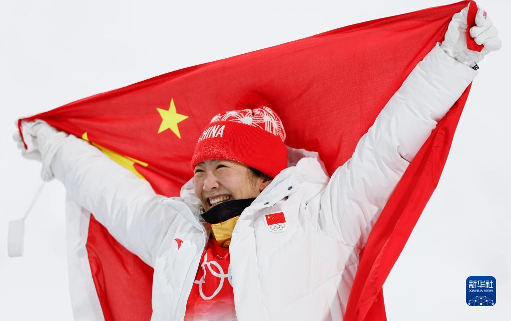 2月14日,中國隊選手徐夢(mèng)桃慶祝奪得自由式滑雪女子空中技巧冠軍。新華社記者 費茂華 攝