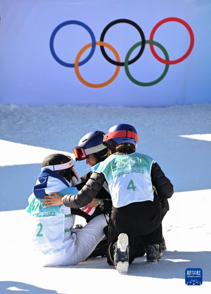 2月8日,中國隊選手谷愛(ài)凌(右)和瑞士隊選手瑪蒂爾德·格雷莫德(中)在比賽后安慰法國隊選手泰絲·勒德。新華社記者 武巍 攝