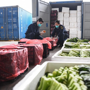 2月21日,在深圳大鏟灣碼頭,深圳海關(guān)工作人員查驗供港蔬菜。新華社記者 梁旭 攝