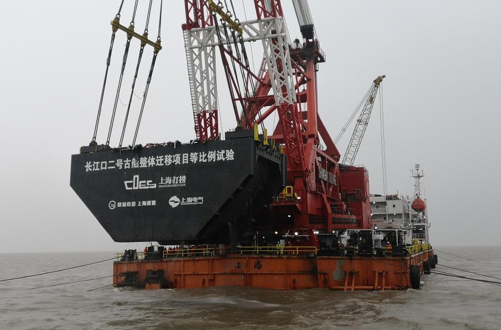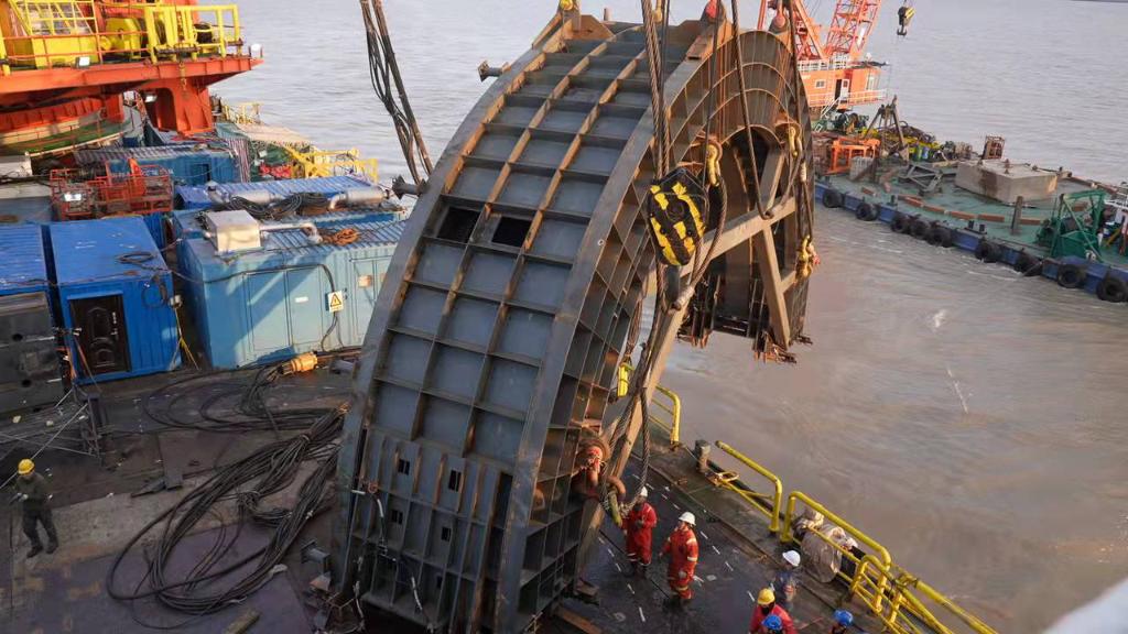 第一步,打撈人員從打撈船上把端板頂梁組合體吊入長(cháng)江口水下,沉入泥中預設位置;