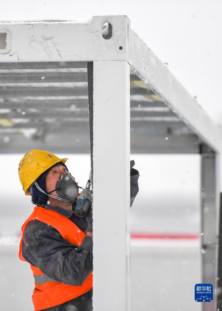 3月15日,工人在吉林市高新南區隔離方艙項目施工現場(chǎng)組裝隔離方艙箱體。新華社記者 張楠 攝