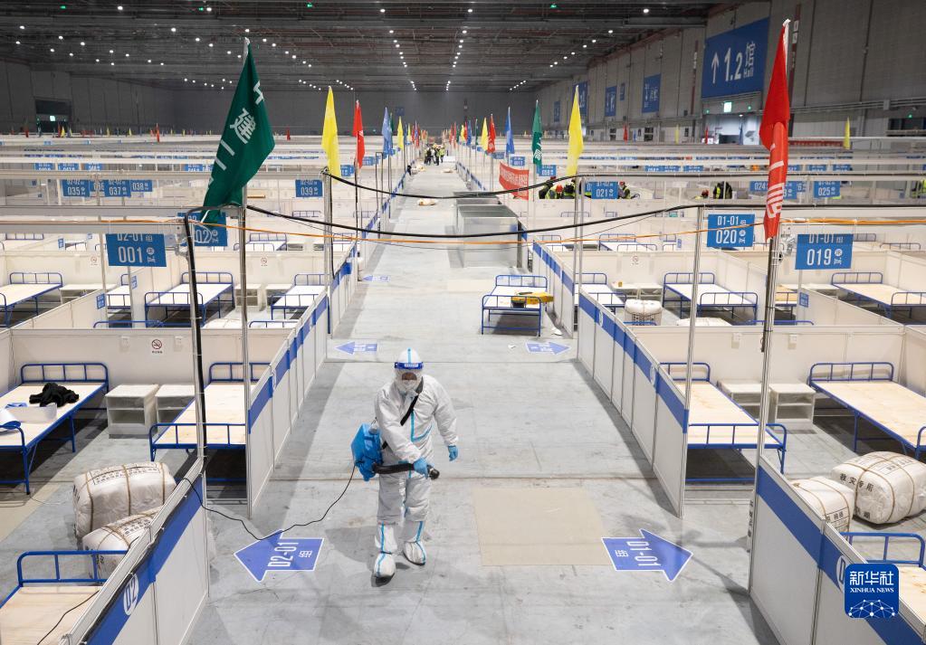 4月8日,工作人員在國家會(huì )展中心(上海)方艙醫院進(jìn)行消殺處理。新華社記者 金立旺 攝