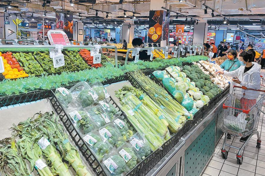 昨天(11日)傍晚,在物美大賣(mài)場(chǎng)玉蜓橋店,蔬菜、肉類(lèi)、面包等生活必需品種類(lèi)豐富、供應充足。 記者 鄧偉攝