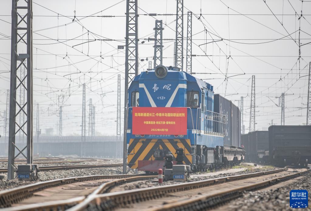 陸海新通道長(cháng)江-中南半島國際聯(lián)運班列(中國果園港-老撾萬(wàn)象-緬甸仰光)從重慶果園港發(fā)出(2022年4月7日攝)。新華社記者 黃偉 攝