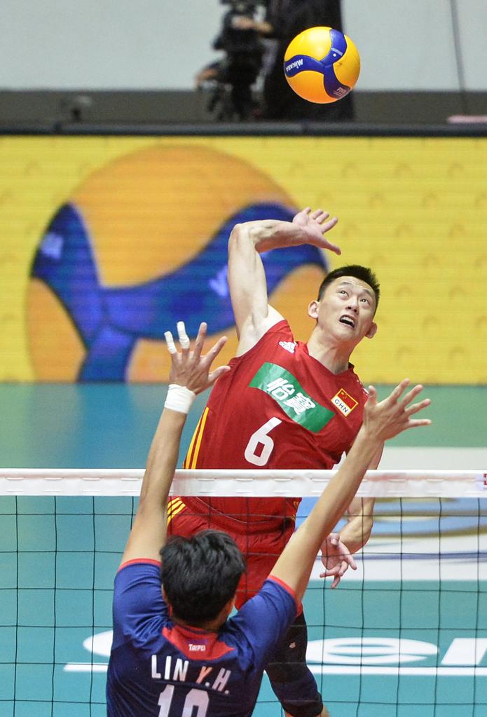 8月8日,中國隊球員俞元泰(右)在比賽中扣球。新華社發(fā)(拉亨攝)
