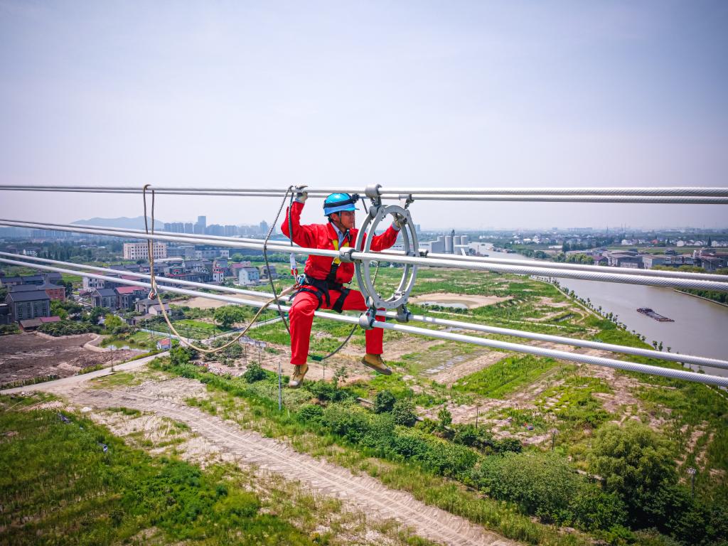 電力工人對白鶴灘——浙江±800千伏特高壓直流輸電工程線(xiàn)路進(jìn)行走線(xiàn)驗收。無(wú)人機照片 新華社記者 江漢 攝