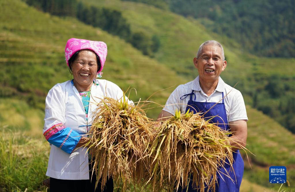 9月14日,在廣西龍勝各族自治縣龍脊鎮龍脊古壯寨,壯族群眾捧著(zhù)剛剛收獲的稻谷。