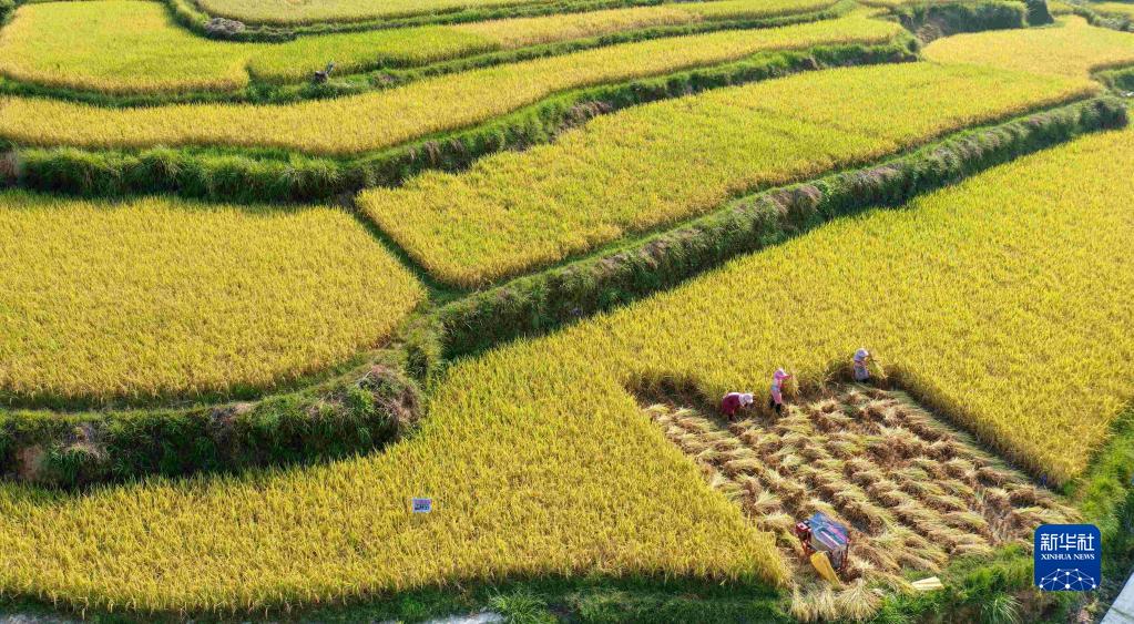 9月9日,農民在貴州省黔東南苗族侗族自治州榕江縣忠誠鎮盤(pán)踅村的梯田上收割稻谷(無(wú)人機照片)。