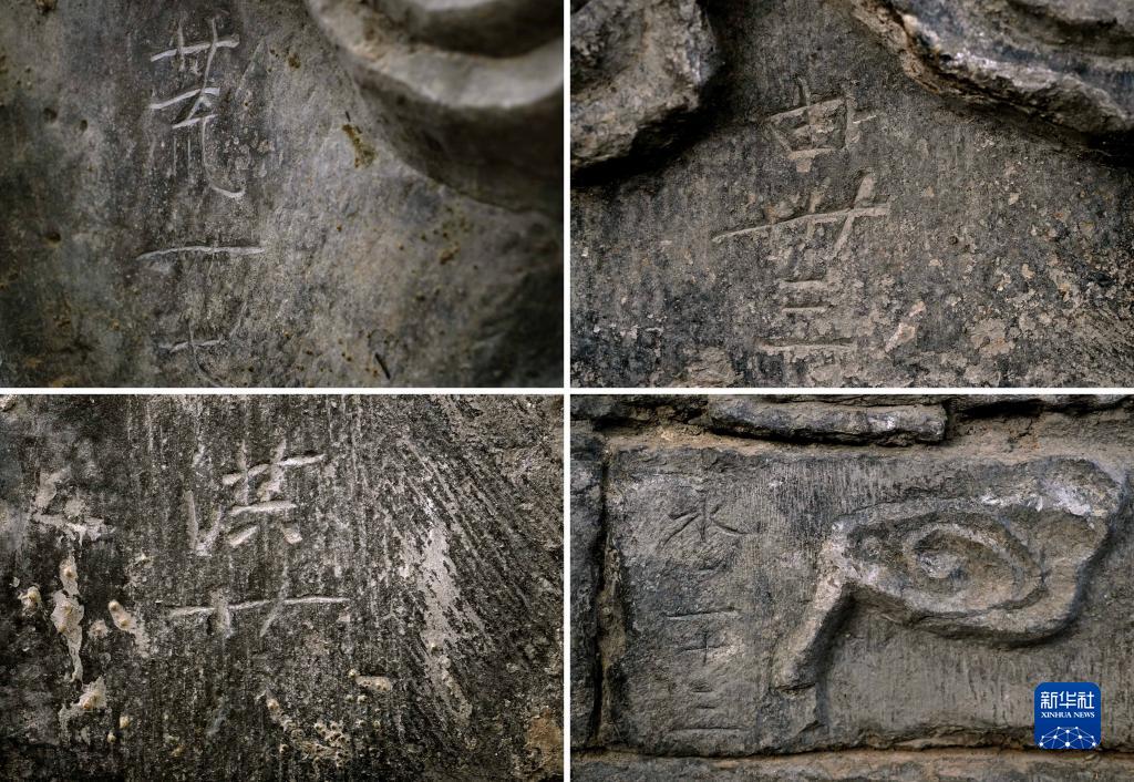 這是巨幅石雕祥瑞壁畫(huà)上的編碼,在宋代砌筑時(shí)起到防止壁畫(huà)錯亂的作用(拼版照片,9月21日攝)。新華社記者 李安 攝
