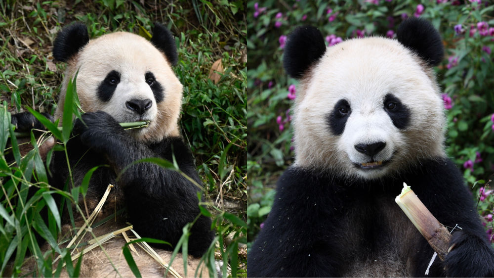 此為拼版圖片。10月17日,在中國大熊貓保護研究中心雅安基地,大熊貓“京京”(左)和“四?!痹诔灾褡?。左圖新華社記者胥冰潔攝,右圖新華社發(fā)(陳居偉攝)。