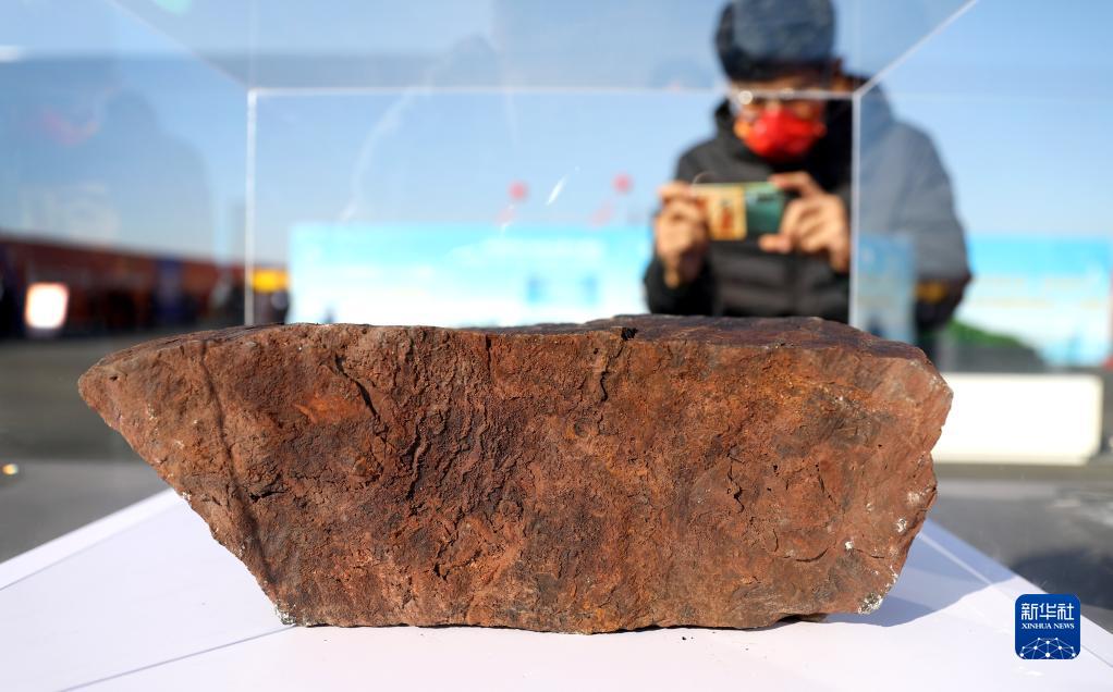 11月16日,參加開(kāi)工儀式的媒體記者在拍攝鐵礦礦石樣本。