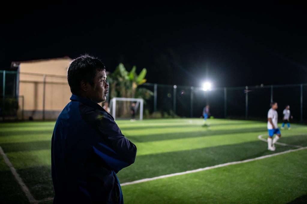 云南省滄源佤族自治縣龍乃村首任足球隊隊長(cháng)鮑志昆在場(chǎng)邊看隊員們踢球。