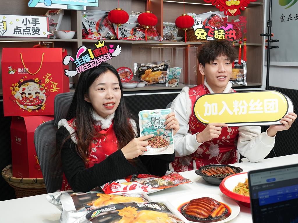 湖南網(wǎng)上年貨節期間,主播們在直播間向網(wǎng)友介紹特色菜品(1月12日攝)。新華社發(fā)