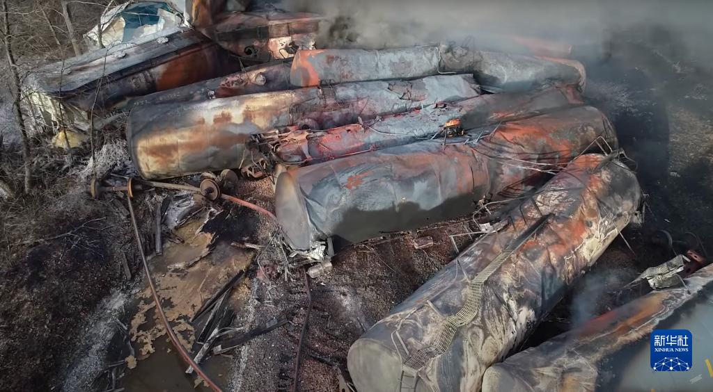 這張美國國家運輸安全委員會(huì )發(fā)布的無(wú)人機視頻截圖顯示的是有毒化學(xué)品運載列車(chē)脫軌事故現場(chǎng)。新華社發(fā)