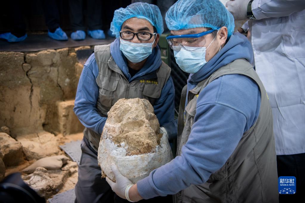 考古隊員展示提取離土的頭骨化石(資料照片)。新華社發(fā)