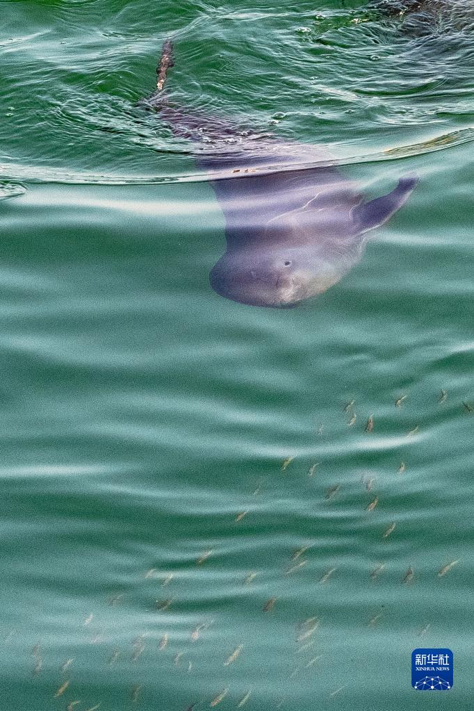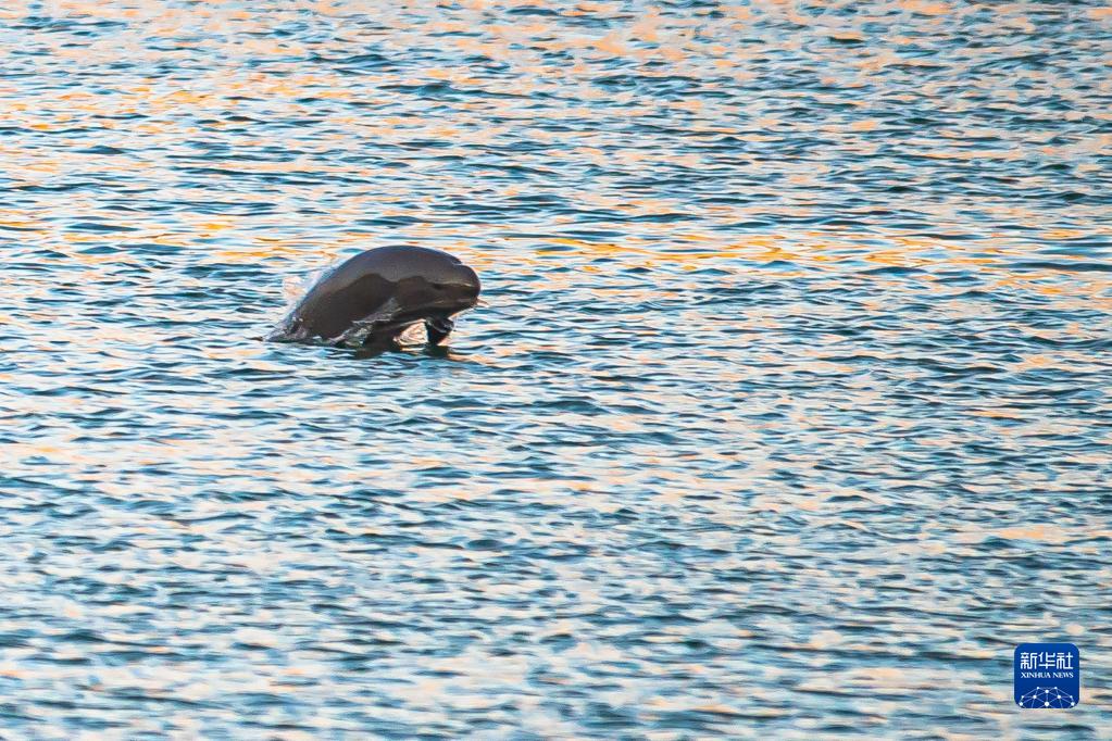 在湖北省宜昌市,長(cháng)江江豚在水中嬉戲(2022年10月11日攝)。新華社記者 肖藝九 攝