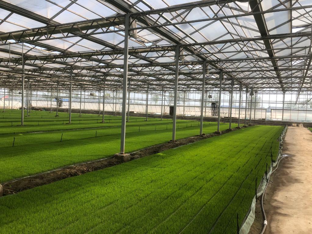 記者來(lái)到遼寧省盤(pán)錦市太平凱地農機服務(wù)專(zhuān)業(yè)合作社,整齊排列的20座育苗大棚里,綠油油的秧苗茁壯成長(cháng),正陸續往5000畝水田里“搬家”。