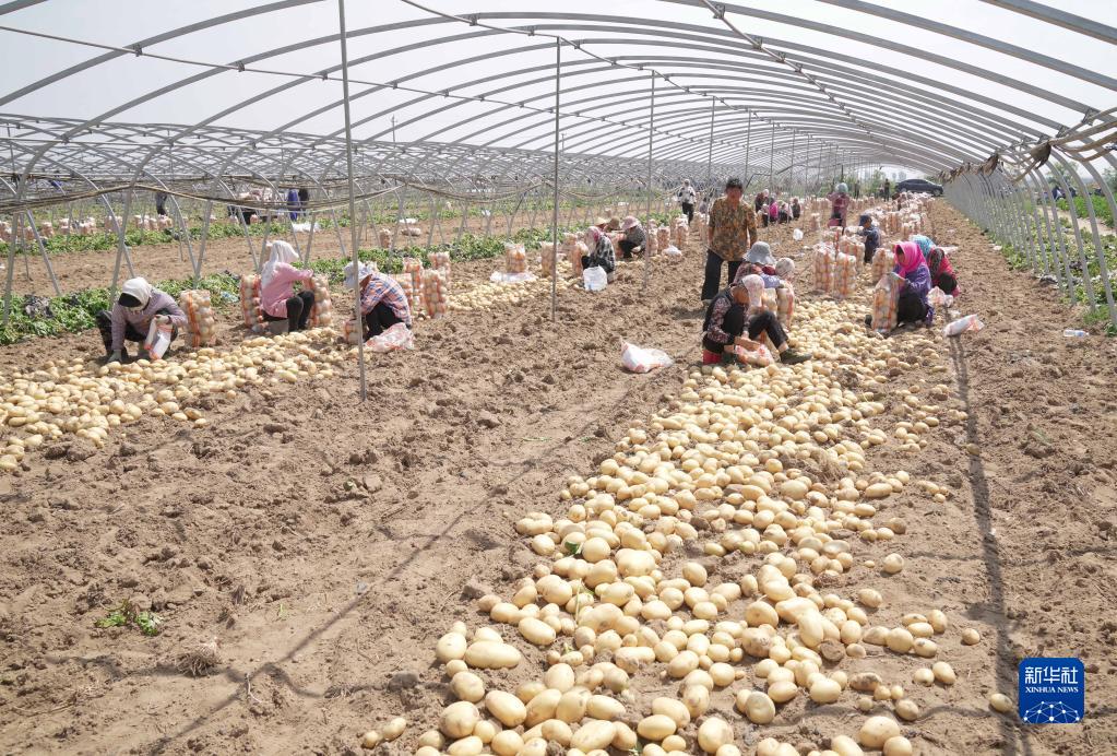 6月8日,昌黎縣新集鎮西新莊村農民在田間收獲馬鈴薯。