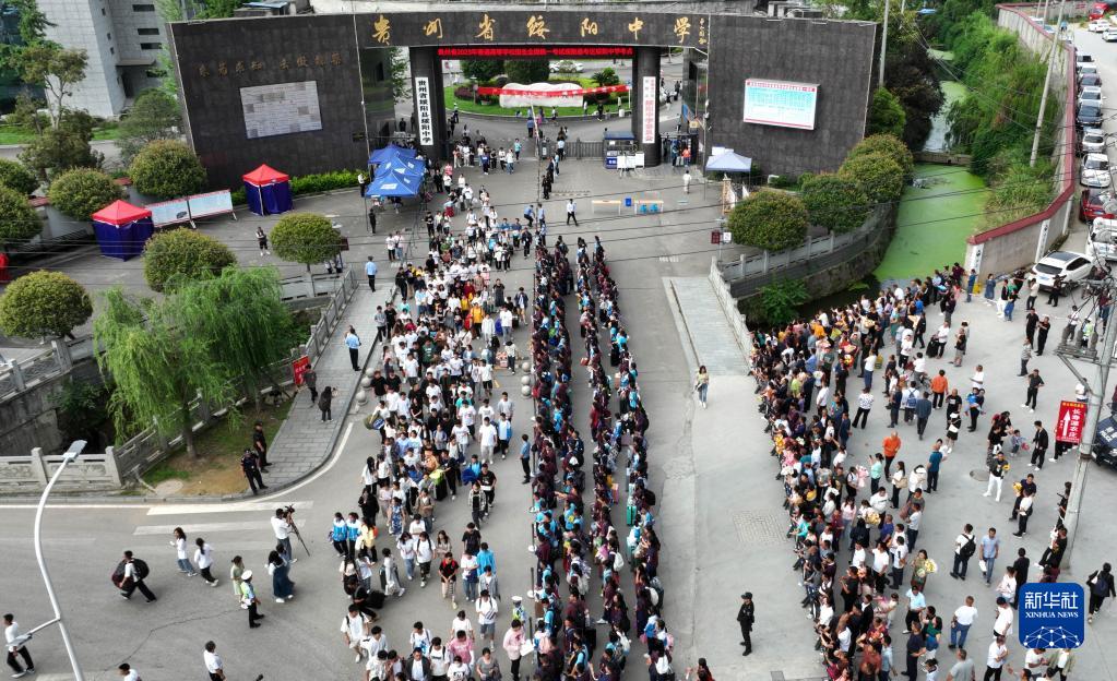 6月8日,考生考試后走出貴州綏陽(yáng)縣綏陽(yáng)中學(xué)2023年高考考點(diǎn)(無(wú)人機照片)。