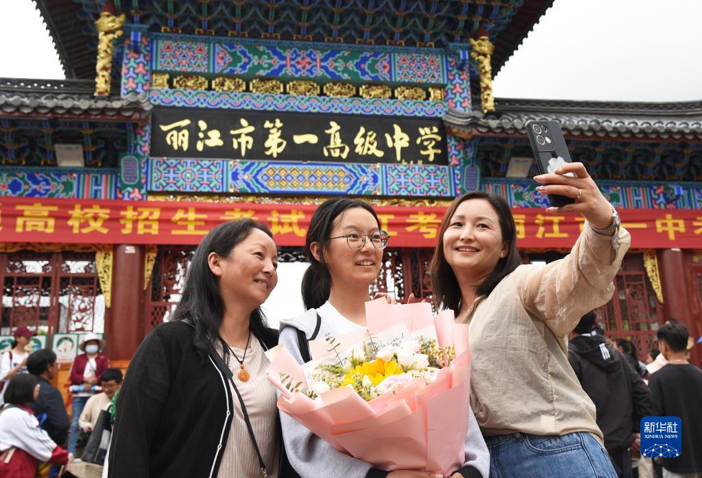 6月8日,在云南麗江市一中考點(diǎn),考生在考試結束后與家人合影。
