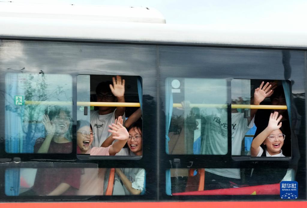 6月8日,在廣西柳州市融水苗族自治縣民族高中,坐著(zhù)送考車(chē)回到學(xué)校的考生向歡迎他們的老師、同學(xué)和家長(cháng)招手。
