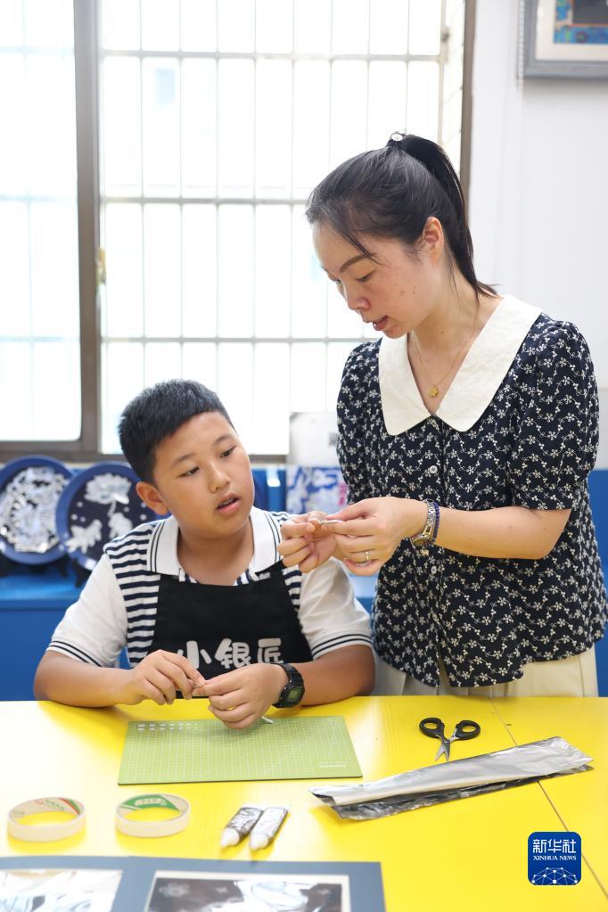 苗族銀飾鍛制技藝是苗族喜愛(ài)的民間傳統工藝,主要用于制作頭飾、面飾、頸飾、手飾等苗族飾品。近年來(lái),在湖南省文化館(湖南省非物質(zhì)文化遺產(chǎn)保護中心)的支持下,長(cháng)沙市朝陽(yáng)小學(xué)開(kāi)設“無(wú)銀無(wú)花不成美”特色美育課程,教授苗族銀飾的歷史淵源、造型特點(diǎn)、主要分類(lèi)、工藝流程、服飾搭配技巧等,學(xué)生們在課堂上可以利用錫箔紙、易拉罐、零食包裝袋等生活中便于獲取的材料制作有苗族銀飾特色的手工作品,讓學(xué)生們在對苗族銀飾的欣賞與制作中,感受非遺之美,傳承優(yōu)秀的傳統文化。
