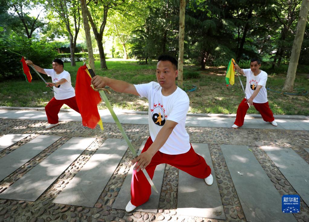 6月9日,太極拳愛(ài)好者在河北省邢臺市任澤區人民廣場(chǎng)展示王其和太極拳器械太極刀。