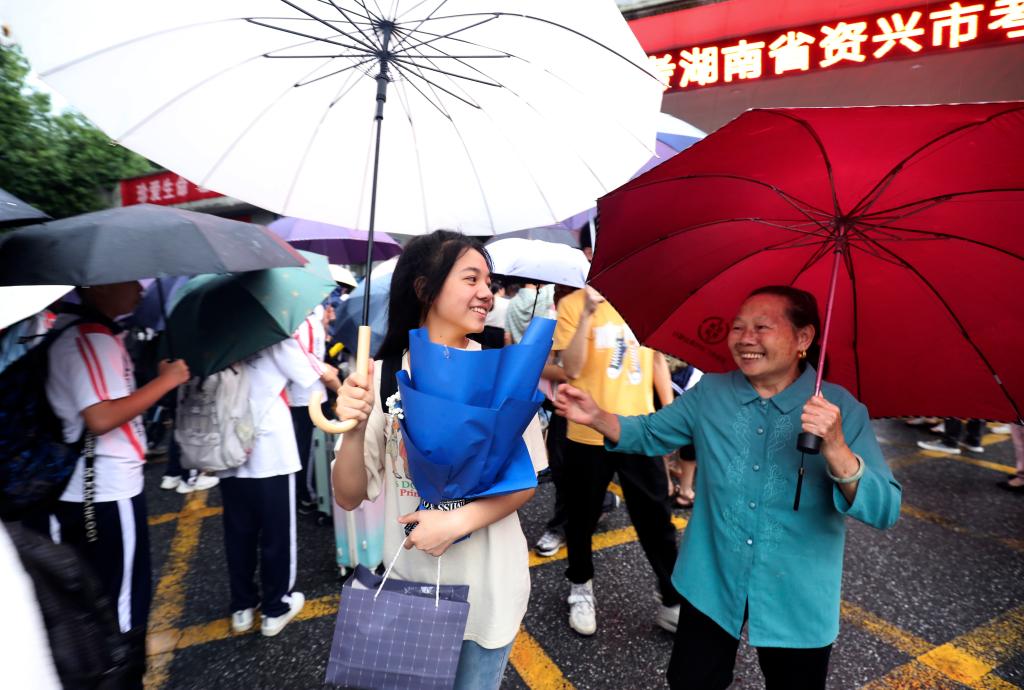 6月9日,在湖南省資興市立中學(xué)考點(diǎn),一名老奶奶給結束高考的孫女送花。