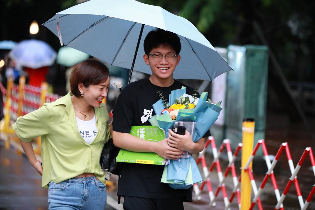 6月9日,在福州第十一中學(xué)考點(diǎn)外,考生(右)手捧鮮花回家。